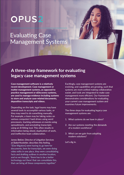 Modern litigation teams are often dispersed, frequently moving between office and remote locations. With Opus 2 Cases for litigation, you can bring stakeholders together in one, cloud-based workspace—litigation support, associates, lawyers, partners, co-counsel, and clients.